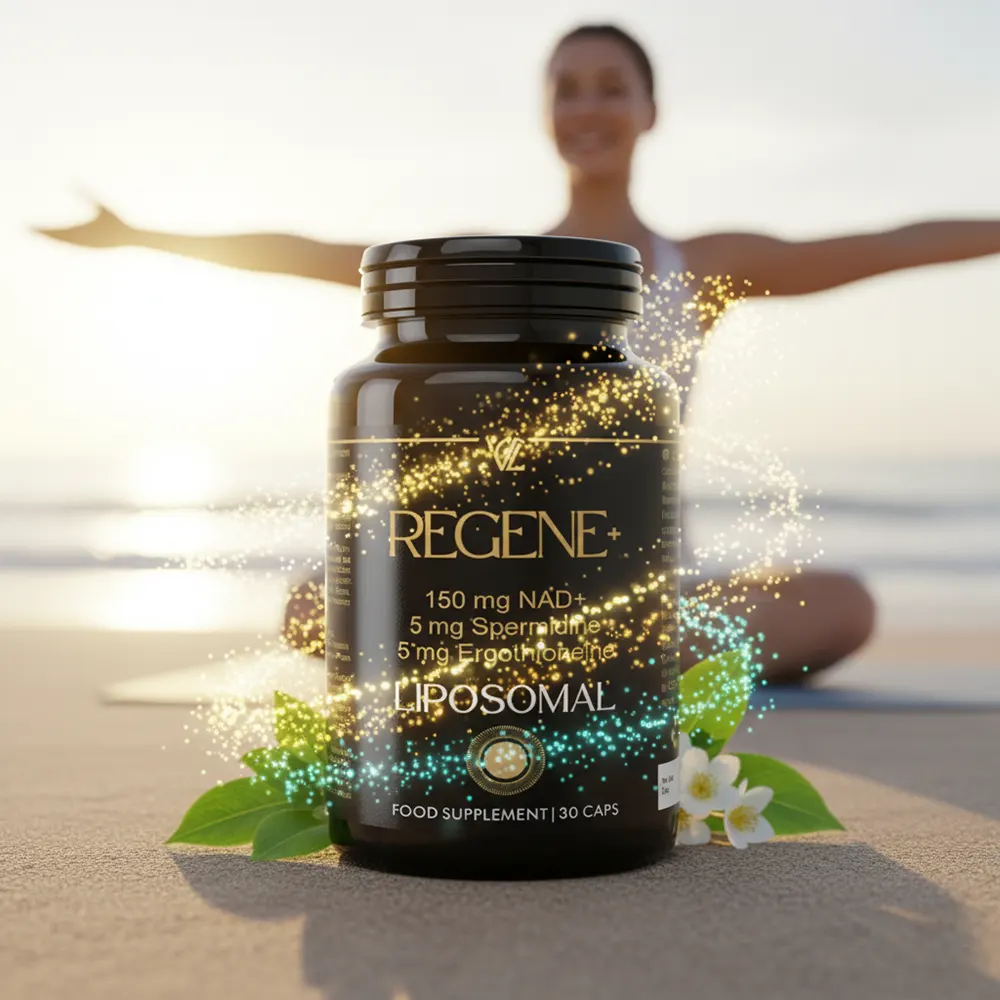 Regene+ Liposomal — NAD+ 150 mg + Spermidine 5 mg + Ergothioneine 5 mg. Triple-action longevity formula for cellular energy, autophagy & antioxidant defence. LipoDry®.